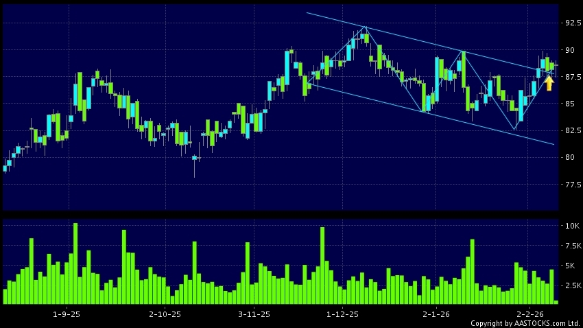MIDEA GROUP(00300.HK)  +1.200 (+1.339%)    Short selling $87.58M; Ratio 30.858%   appears an upside range breakout. Last printed at 88.750; rose 0.681%; on volume of 707.19K shares and turnover of $62.44M