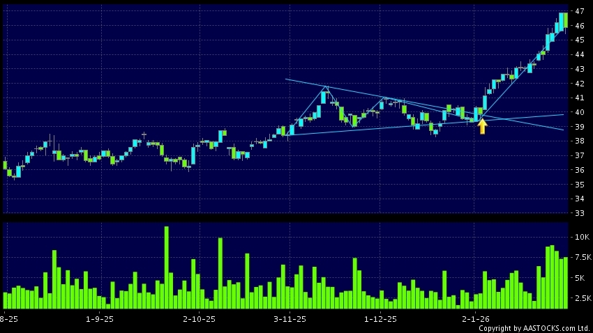 Triangle Breakout means the volatility of price movement is decreasing, stock price finally broke the top of triangle. An upward trend will start.(HK stocks quote is delayed for at least 15 mins.Short Selling Data as at 2026-01-30 16:25.)
