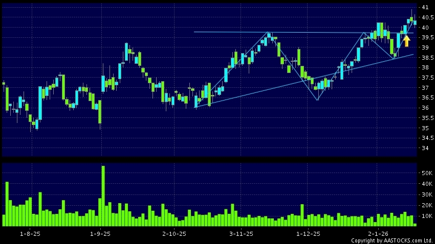 BOC HONG KONG(02388.HK) shows a triangle breakout. Last printed at 40.340; rose 0.099%; on volume of 3.15M shares and turnover of $126.88MRecent PerformanceIn 3 days: +0.599%In 5 d...