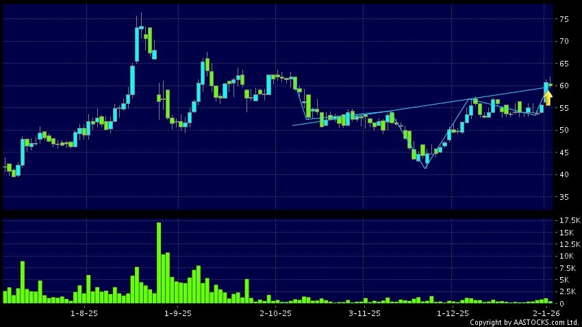 CIRRUS(02507.HK) appears an upside breakout, rose above the neckline. Last printed at 59.700; fell 1.647%; on volume of 462.50K shares and turnover of $27.91MRecent PerformanceIn 3...