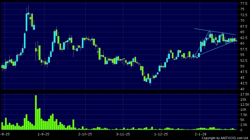 CIRRUS(02507.HK)  0.000 (0.000%)    Short selling $950.11K; Ratio 1.662%   shows a triangle breakout. Last printed at 61.000; Flattish; on volume of 143.00K shares and turnover of $8.76M