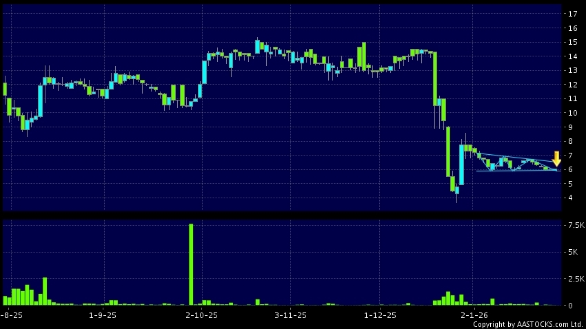 Triangle Breakout means the volatility of price movement is decreasing, stock price finally broke the bottom of triangle. A downward trend will start.(HK stocks quote is delayed for at least 15 mins.)