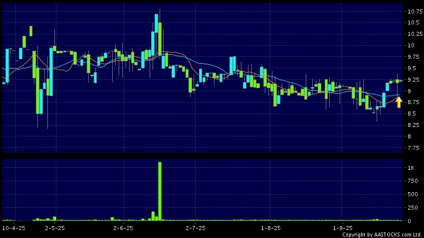 SYNTRUST GK(08629.HK)  +0.050 (+0.775%)   's SMA 10 crosses above SMA 20, which is a golden cross. Last printed at 9.210; rose 0.436%; on volume of 13.00K shares and turnover of $119.93K
