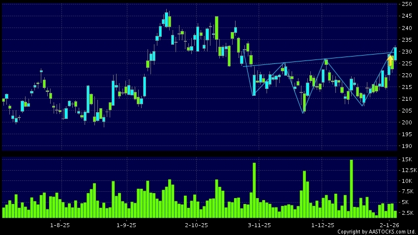 NTES-S(09999.HK) appears an upside breakout, rose above the neckline. Last printed at 231.600; rose 4.043%; on volume of 2.96M shares and turnover of $679.41MRecent PerformanceIn 3...