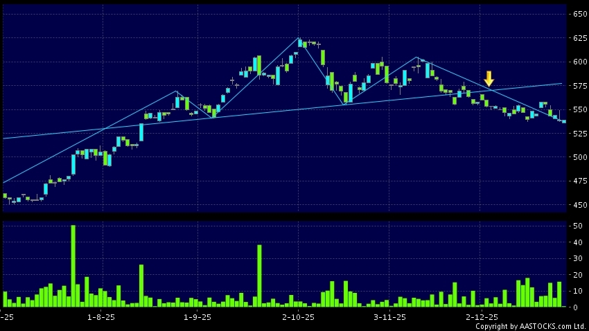TENCENT-R(80700.HK)  0.000 (0.000%)    Short selling $269.75K; Ratio 9.816%   appears a downside breakout, dropped below the neckline. Last printed at 539.000; rose 0.186%; on volume of 600.00 shares and turnover of $322.00K
