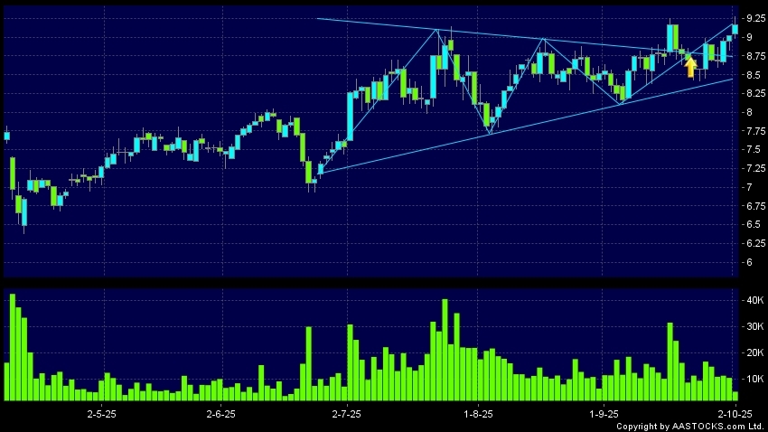 三角形向上突破是指股价的波幅渐渐收窄,在图表上形成三角形般的状态。股价在三角形的末端向上突破,形成上升趋势,技术走势向好。(港股报价延迟最少十五分钟。沽空资料截至 2025-10-10 16:25。)