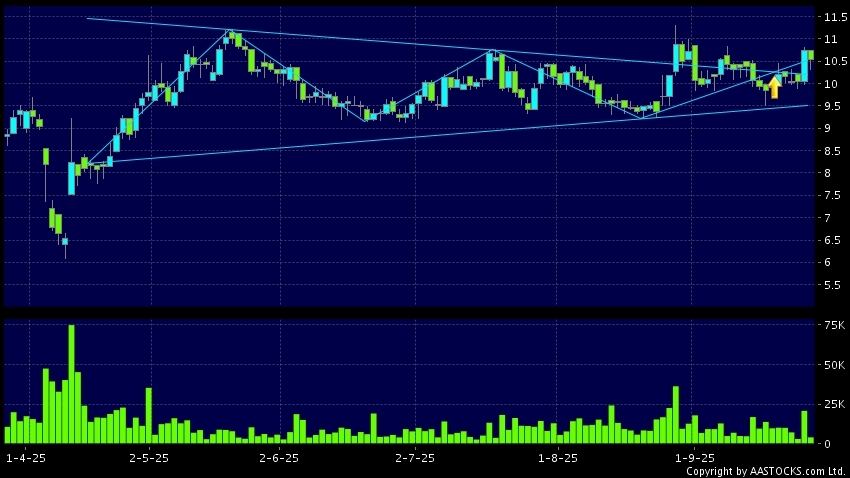 三角形向上突破是指股价的波幅渐渐收窄,在图表上形成三角形般的状态。股价在三角形的末端向上突破,形成上升趋势,技术走势向好。(港股报价延迟最少十五分钟。沽空资料截至 2025-10-10 16:25。)
