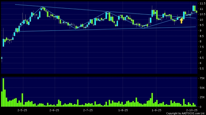 三角形向上突破是指股价的波幅渐渐收窄,在图表上形成三角形般的状态。股价在三角形的末端向上突破,形成上升趋势,技术走势向好。(港股报价延迟最少十五分钟。沽空资料截至 2025-10-10 16:25。)