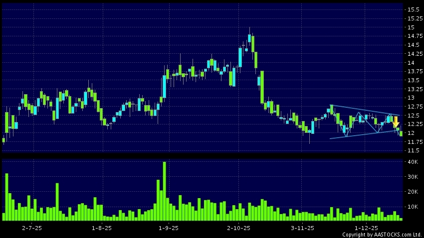 三角形向下突破是指股价的波幅渐渐收窄,在图表上形成三角形般的状态。股价在三角形的末端向下突破,下跌趋势形成,技术走势偏软。(港股报价延迟最少十五分钟。沽空资料截至 2025-12-16 16:25。)