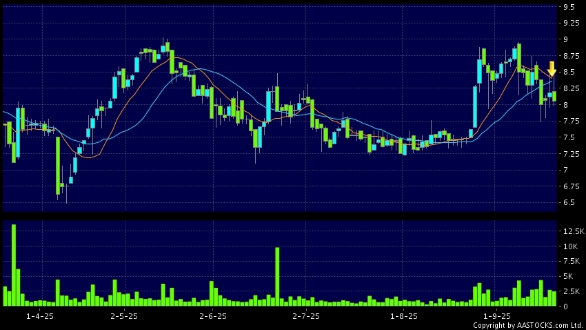 晋景新能(01783.HK) -0.260 (-6.915%) 沽空 $2.13百万; 比率 3.326% 10天移动平均线跌穿20天移动平均线,出现死亡交叉。现价报8.050,下跌1.589%,成交量2.46百万股,成交额2.03千万。
