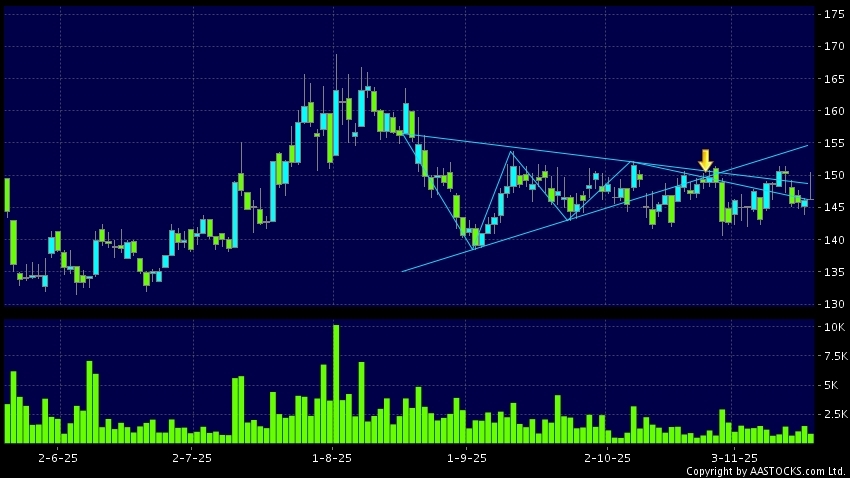 三角形向下突破是指股价的波幅渐渐收窄,在图表上形成三角形般的状态。股价在三角形的末端向下突破,下跌趋势形成,技术走势偏软。(港股报价延迟最少十五分钟。沽空资料截至 2025-11-21 16:25。)