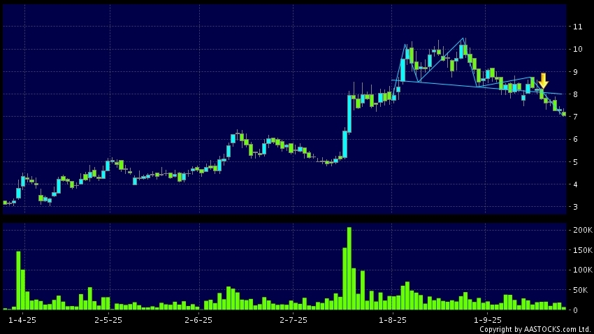 乐普生物-B(02157.HK) -0.080 (-1.107%) 沽空 $4.67百万; 比率 4.675% 呈现头肩顶向下突破。现价报7.090,下跌3.010%,成交量7.36百万股,成交额5.25千万。