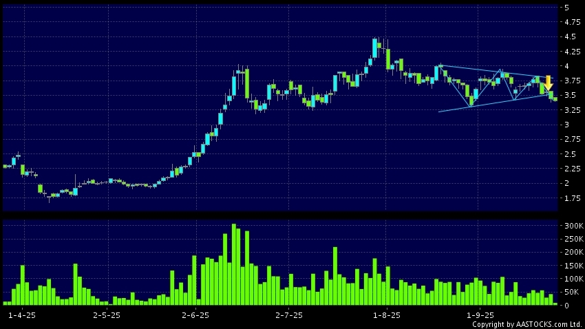 三角形向下突破是指股价的波幅渐渐收窄,在图表上形成三角形般的状态。股价在三角形的末端向下突破,下跌趋势形成,技术走势偏软。(港股报价延迟最少十五分钟。沽空资料截至 2025-10-10 16:25。)