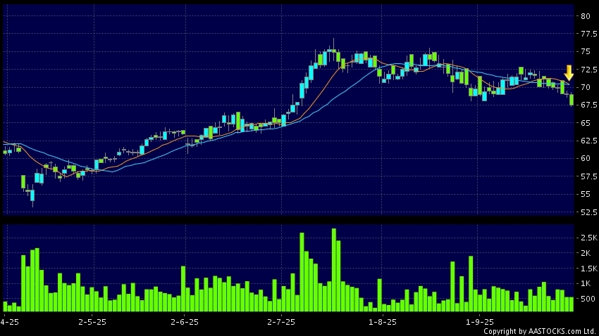 中银航空租赁(02588.HK) -1.050 (-1.479%) 沽空 $73.50万; 比率 1.151% 10天移动平均线跌穿20天移动平均线,出现死亡交叉。现价报67.900,下跌1.594%,成交量58.58万股,成交额3.97千万。
