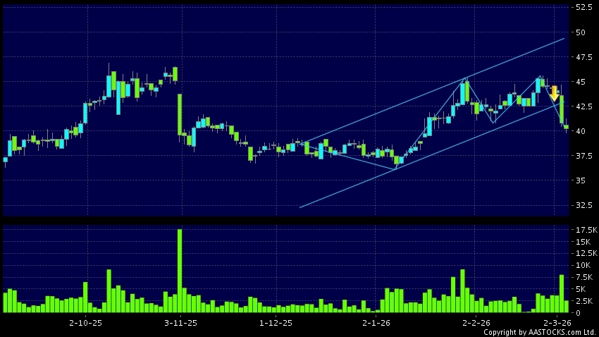 区域突破指股价在过去的一段时间只在一个范围在内活动,然後股价下跌作出突破,跌穿区域的底部,技术走势偏软。(港股报价延迟最少十五分钟。沽空资料截至 2026-03-04 16:25。)