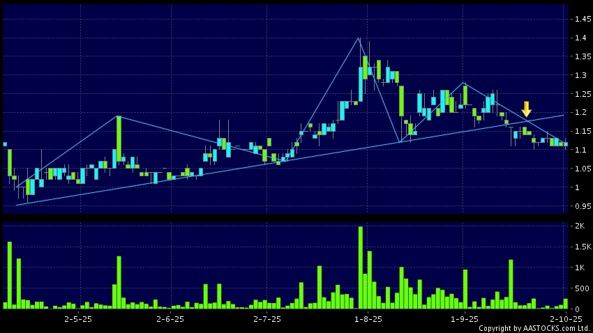 头肩顶是典型的沽出讯号,当股价跌穿支持线(颈线)时,跌势确认股价将持续下跌,技术走势偏软。(港股报价延迟最少十五分钟。)