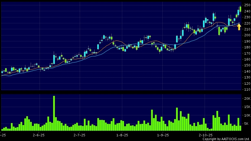 黄金交叉是一个利好讯号,指股价的短期移动平均线升穿长期移动平均线,例如50天线升穿250天线,在图表上构成交叉的形状。股价通常会上升形成一个上升趋势,技术走势向好。(港股报价延迟最少十五分钟。沽空资料截至 2025-10-30 16:25。)