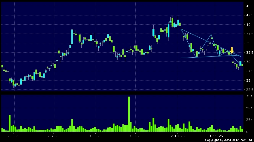 三角形向下突破是指股价的波幅渐渐收窄,在图表上形成三角形般的状态。股价在三角形的末端向下突破,下跌趋势形成,技术走势偏软。(港股报价延迟最少十五分钟。沽空资料截至 2025-11-21 16:25。)