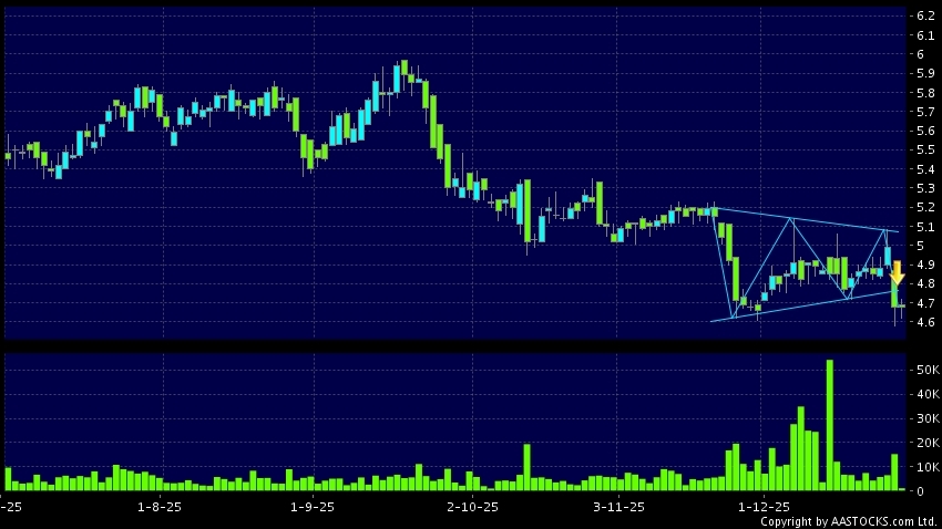 三角形向下突破是指股價的波幅漸漸收窄,在圖表上形成三角形般的狀態。股價在三角形的末端向下突破,下跌趨勢形成,技術走勢偏軟。(港股報價延遲最少十五分鐘。沽空資料截至 2025-12-29 16:25。)