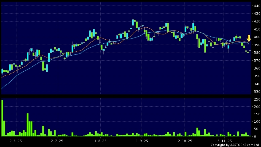 香港交易所-R(80388.HK) 0.000 (0.000%) 沽空 $79.95萬; 比率 28.324% 10天移動平均線跌穿20天移動平均線,出現死亡交叉。現價報382.600,上升0.684%,成交量4.50千股,成交額1.72百萬。