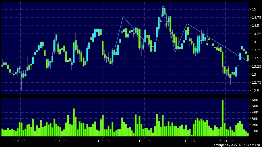 中國海外發展(00688.HK) -0.210 (-1.540%) 沽空 $1.11億; 比率 47.035% 呈現三重頂突破向下。現價報13.420,下跌1.613%,成交量6.65百萬股,成交額8.94千萬。