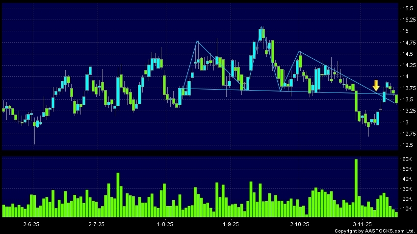 中國海外發展(00688.HK) -0.210 (-1.540%) 沽空 $1.11億; 比率 47.035% 呈現頭肩頂向下突破。現價報13.420,下跌1.613%,成交量6.65百萬股,成交額8.94千萬。
