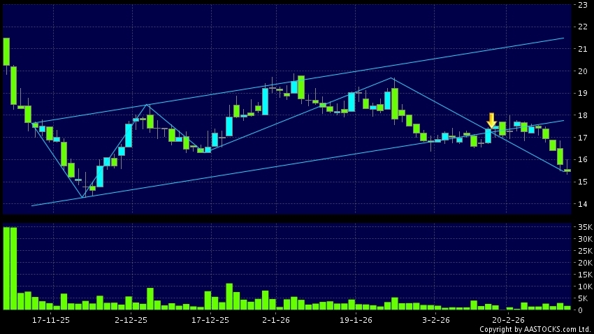 區域突破指股價在過去的一段時間只在一個範圍在內活動,然後股價下跌作出突破,跌穿區域的底部,技術走勢偏軟。(港股報價延遲最少十五分鐘。)