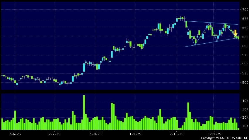 三角形向下突破是指股價的波幅漸漸收窄,在圖表上形成三角形般的狀態。股價在三角形的末端向下突破,下跌趨勢形成,技術走勢偏軟。(港股報價延遲最少十五分鐘。沽空資料截至 2025-11-20 16:25。)