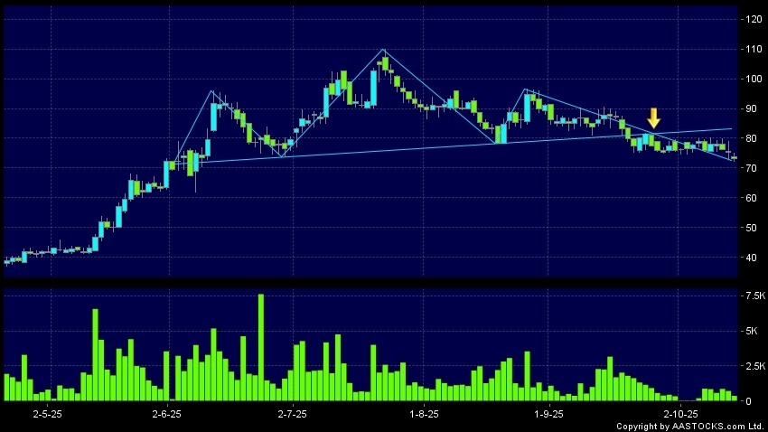 頭肩頂是典型的沽出訊號,當股價跌穿支持線(頸線)時,跌勢確認股價將持續下跌,技術走勢偏軟。(港股報價延遲最少十五分鐘。)
