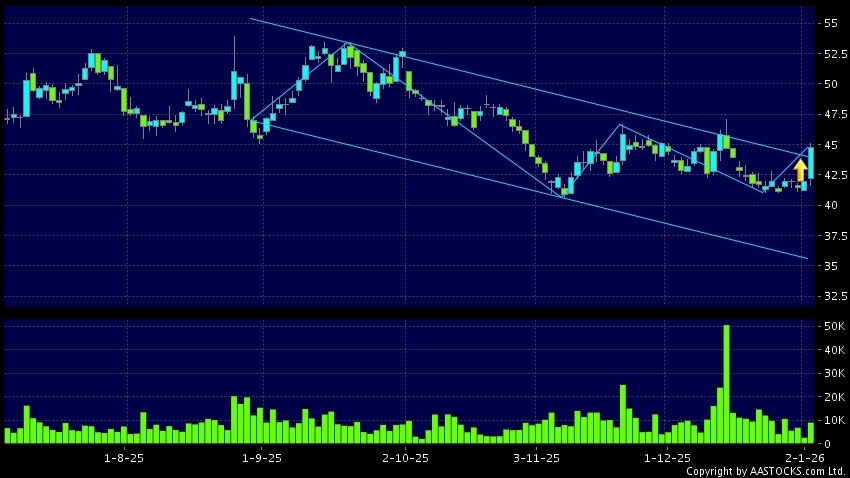 區域突破指股價在過去的一段時間只在一個範圍在內活動,然後股價上升作出突破,升穿區域的頂部,技術走勢向好。(港股報價延遲最少十五分鐘。沽空資料截至 2026-01-09 16:25。)