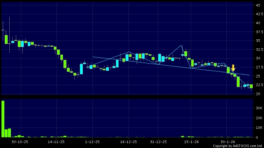 頭肩頂是典型的沽出訊號,當股價跌穿支持線(頸線)時,跌勢確認股價將持續下跌,技術走勢偏軟。(港股報價延遲最少十五分鐘。)