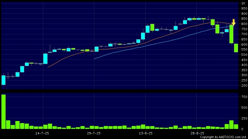死亡交叉是一個利淡信號,指股價的短期移動平均線跌穿長期移動平均線,例如50天線跌穿250天線,在圖表上構成交叉的形狀。股價通常會下跌形成一個下降趨勢,技術走勢偏軟。(港股報價延遲最少十五分鐘。)