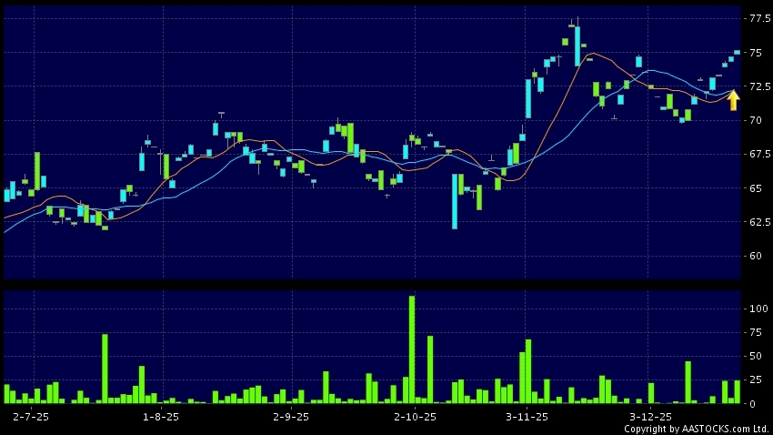 友邦保險-R(81299.HK) +0.700 (+0.938%) 10天移動平均線升穿20天移動平均線,出現黃金交叉。現價報75.100,上升0.535%,成交量2.44萬股,成交額1.83百萬。